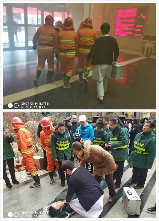 山西惠民医院与全体参会人员进行了消防疏散演练及灭火器实际操作演练。山西惠民医院住院部张美兰护士长参与演练,并现场向参加人员以及周边围观群众示意并讲解相关急救知识。